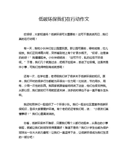让我们一起行动起来,把低碳环保放在心间,保护我们的地球妈妈!作文二亲爱的小伙伴们,你们有没有想过,我们每天生活的地方,怎样才能变得更美好呢?其实呀,只要我们心里装着低碳环保,就能做出大改变!我给你们讲个小故事。