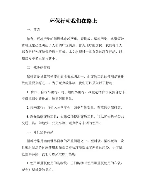 环保行动我们在路上一、前言如今,环境污染的问题越来越严重,碳排放、塑料污染、水资源浪费等现象已经引起了人们的广泛关注。