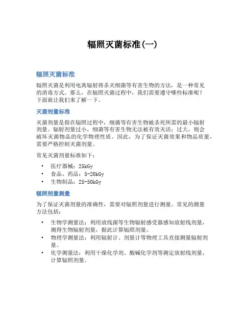 常见灭菌剂量标准如下:•医疗器械:25kGy•食品、药品:5-20kGy•生物制品:25-50kGy辐照剂量测量为了保证灭菌剂量的准确性,需要对辐照剂量进行测量。