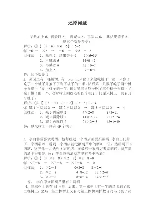 还原问题1. 某数加上6,再乘以6,再减去6,再除以6,其结果等于6,则这个数是多少?解析:①【(?+6)×6-6】÷6=6②+6 →×6 →-6 →÷6 = 6倒推法:1、除以6,结果等于6 6×6=362、再减去6 36+6=423、再乘以6 42÷6=74、加上6 7-6=1答:这个数是12. 果园里有一棵桃树. 有一天,三只猴子来偷吃桃子,第一只猴子吃了一个桃子并摘下了剩下桃子的一半,然后第二只猴子吃了两个桃子并摘下了剩下桃子的一半,最后第三只猴子吃了三个桃子并摘下了剩下桃子的一半. 这时树上刚好还有四个桃子,问原来树上一共有几个桃子?解析:①{【(?-1)÷2-2】÷2-3}÷2=4②减1再除以2 →减2再除以2 →减3再除以2 = 4倒推法:1、减3再除以2 4×2=8 8+3=112、减2再除以2 11×2=22 22+2=243、减1再除以2 24×2=48 48+1=49答:原来树上一共有49个桃子3. 李白非常喜欢喝酒,他每经过一个酒店都要买酒喝. 李白出门带了一个酒葫芦,看到一个酒店就把酒葫芦中的酒加一倍,然后喝下8两酒,这天他一共遇到3家酒店,在最后一家酒店喝完酒后,葫芦里的酒刚好喝完. 问:李白原来酒葫芦里有多少两酒?解析:①【(?×2-8)×2-8】×2-8 =0②×2-8 →×2-8 →×2-8 = 0倒推法:1、×2-8 0+8=8 8÷2=42、×2-8 4+8=12 12÷2=63、×2-8 6+8=14 14÷2=7答:李白原来酒葫芦里有7两酒4. 三棵树上共有48只鸟. 后来,第一棵树上有一半的鸟飞到了第二棵树上;之后,第二棵树上又有与第三棵树同样数目的鸟飞到了第三棵树上;最后,第三棵树上又有10只鸟飞到了第一棵树上,此时三棵树上的鸟一样多. 问:一开始三棵树上各有几只鸟?解析:第一棵第二棵第三棵①第一棵÷2 第二棵+第一棵÷2②(第二棵+第一棵÷2)-第三棵第三棵×2③第一棵÷2+10 第三棵×2-1016 16 16第一棵树上的鸟:16-10=6 6×2=12第二棵树上的鸟:16+13=29 29-6=23第三棵树上的鸟:16+10=26 26÷2=13答:一开始三棵树上各有12、23、13只鸟。