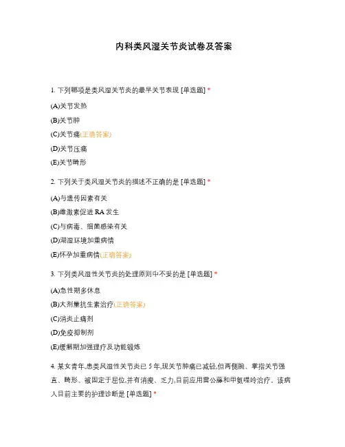内科类风湿关节炎试卷及答案1. 下列哪项是类风湿关节炎的最早关节表现 [单选题] *(A)关节发热(B)关节肿(C)关节痛(正确答案)(D)关节压痛(E)关节畸形2. 下列关于类风湿关节炎的描述不正确的是 [单选题] *(A)与遗传因素有关(B)雌激素促进RA发生(C)与病毒、细菌感染有关(D)湖湿环境加重病情(E)怀孕加重病情(正确答案)3. 下列类风湿性关节炎的处理原则中不妥的是 [单选题] *(A)急性期多休息(B)大剂量抗生素治疗(正确答案)(C)消炎止痛剂(D)免疫抑制剂(E)缓解期加强理疗及功能锻炼4. 某女青年,患类风湿性关节炎已5年,现关节肿痛已减轻,但两侧腕、掌指关节强直、畸形、被固定于屈位,并有消瘦、乏力,目前应用雷公藤和甲氨喋呤治疗。