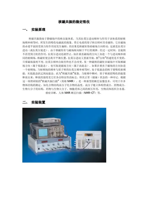 核磁共振的稳态吸收材料物理 07305883 毛骏 合作人:张广炜一、实验目的1、了解核磁共振原理2、利用核磁共振方法确定样品的旋磁比γ、朗德因子g N 和原子核的磁矩μI3、用核磁共振测磁场强度二、实验原理1.单个核的磁共振通常将原子核的总磁矩在其角动量P方向上的投影μ称为核磁矩,它们之间的关系通常写成P m e g P PN∙∙=∙=2μγμ或式中PN m e g 2∙=γ称为旋磁比;e 为电子电荷;m 为质子质量;N g 为朗德因子。
