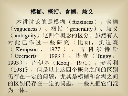 1.语⽤模糊的术语界定 “语⽤模糊”这个术语最早是七⼋⼗年代由利奇(cf.Leech1977);布朗和列⽂森(Brown&Levinson1978[1987])提出来的。