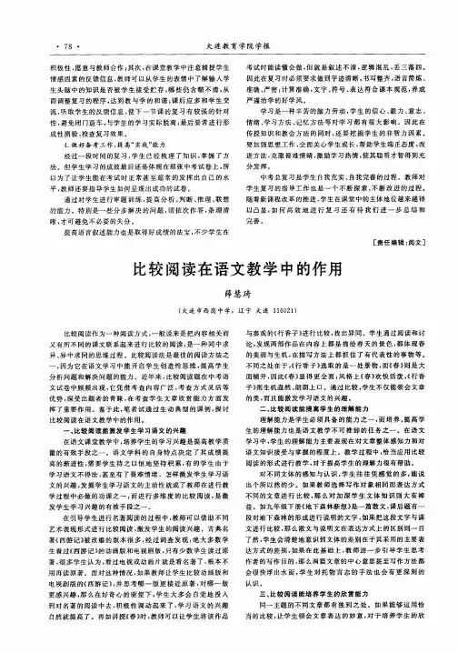 比较阅读在小说阅读中的作用语文教学的最终目的是对学生听、说、读、写能力的培养,因此阅读能力的培养是初中语文教学的重要组成部分,而比较阅读在阅读教学中有着不可忽视的作用。