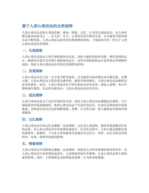 属于人类心理活动的自然规律人类心理活动是指人类的思维、感知、情绪、记忆、行为等方面的活动,是人体内最为复杂的活动之一。