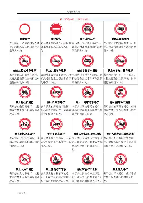 警告标志(警告车辆、行人注意危险地点的标志)十字交叉T形交叉T形交叉T形交叉Y形交叉环形交叉向左急弯路向右急弯路反向弯路连续弯路上陡坡下陡坡两侧变窄右侧变窄左侧变窄窄桥双向交通注意行人注意儿童注意牲畜禁止拖拉机通行禁止农用运输车通行禁止大型客车通行禁止小型客车通行禁止汽车拖、挂车通行禁止二轮摩托车通行禁止某两种车通行禁止非机动车通行禁止畜力车通行禁止人力货运三轮车通行禁止人力车通行禁止骑自行车下坡禁止骑自行车上坡禁止行人通行禁止人力客运三轮车通行禁止向左转弯禁止向右转弯禁止直行禁止向左向右转弯禁止直行和向左转弯禁止直行和向右转弯禁止掉头禁止超车解除禁止超车禁止车辆临时或长时停放禁止车辆长时停放禁止鸣喇叭限制宽度限制高度限制质量驶机动车车道非机动车行驶非机动车车道允许掉头指路标志(传递道路方向、距离信息的标志)1、一般道路指路标志地名着名地名行政区划分界道路管理分界国道编号省道编号县道编号交叉路口预告十字交叉路口丁字交叉路口环形交叉路口互通式立交分岔处地点距离此路不通火车站飞机场停车场残疾人专用设施指路标志(传递道路方向、距离信息的标志)1、高速公路指路标志入口预告入口预告入口预告入口起点终点预告终点提示终点下一出口出口编号预告出口预告出口预告(两个出口)出口地点方向地点方向地点方向车道的边缘,或用来划分机动车道与非机动车道的分界)禁止变换车道线(白色实线)入待转区,等待左转。