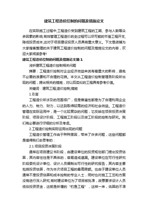 论建设工程造价工作的控制管理建筑工程造价在我国长期存在概算超估算、预算超概算、决算超预算的“三超“现象,严重困扰着建设工程投资效益管理。