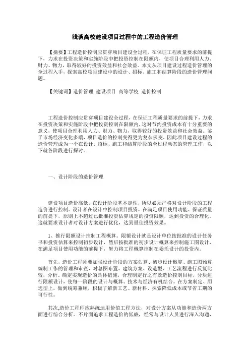 浅谈高校建设项目过程中的工程造价管理【摘要】工程造价控制应贯穿项目建设全过程,在保证工程质量要求的前提下,力求在投资决策和实施阶段中把投资控制在限额内,使项目合理利用人力、财力、物力,取得较好的投资效益和社会效益。