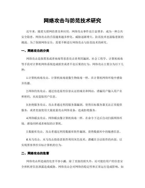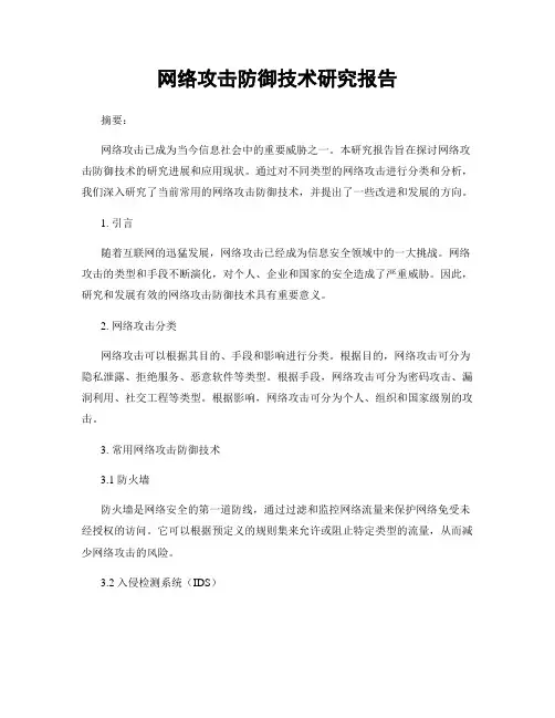 网络攻击防御技术研究报告摘要:网络攻击已成为当今信息社会中的重要威胁之一。