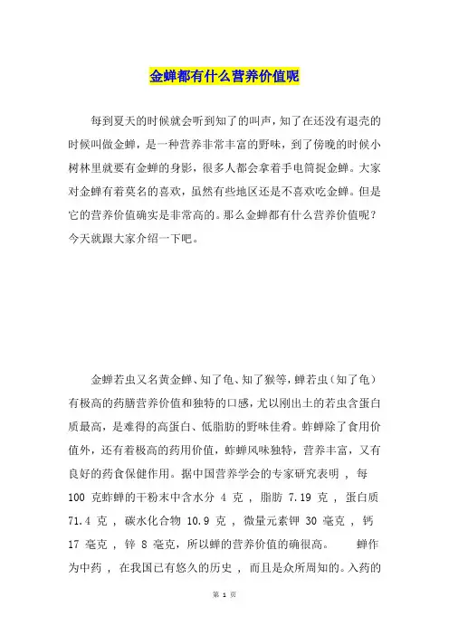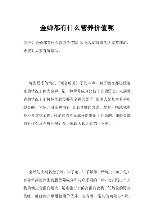 金蝉都有什么营养价值呢关于《金蝉都有什么营养价值呢》,是我们特意为大家整理的,希望对大家有所帮助。