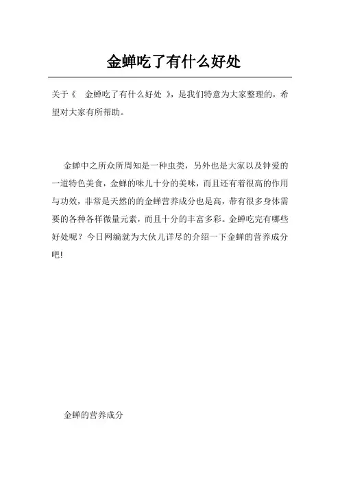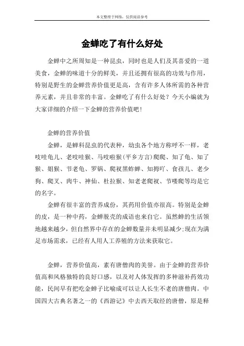 野生金蝉的营养价值关于《野生金蝉的营养价值》,是我们特意为大家整理的,希望对大家有所帮助。
