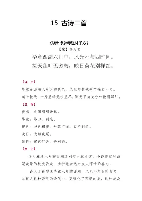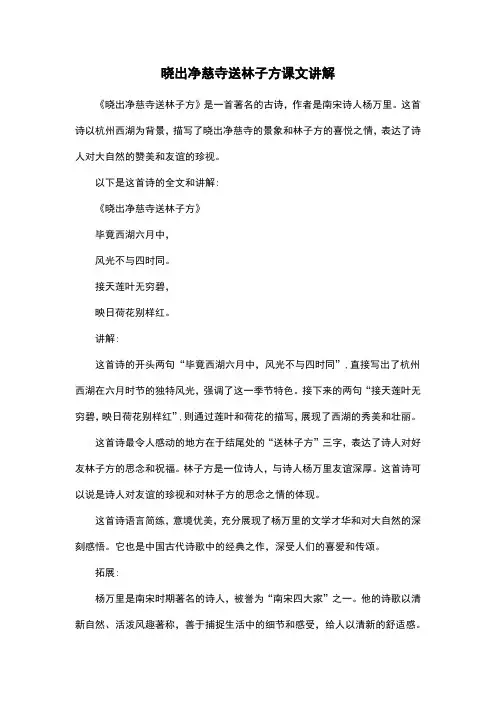 杨万里《晓出净慈寺送林子方》原文和翻译杨万里《晓出净慈寺送林子方》原文和翻译《晓出净慈寺送林子方》原文毕竟西湖六月中,风光不与四时同。