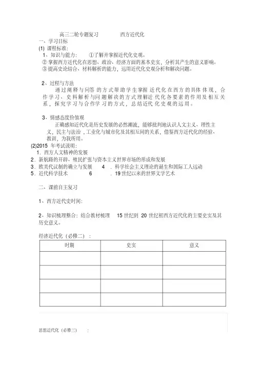 热点专题二近代以来中西方的近代化道路【热点解读】近代化(现代化)就是传统社会向现代社会的变迁过程,它会引起社会生产力、经济制度、政治制度、思想文化乃至人们的生活方式、价值观念和心理态度的多元化等各个方面的变革,具体包括政治上的民主化、法制化,经济上的工业化、商品化,思想上的理性化、科学化,社会习俗的近代化等。
