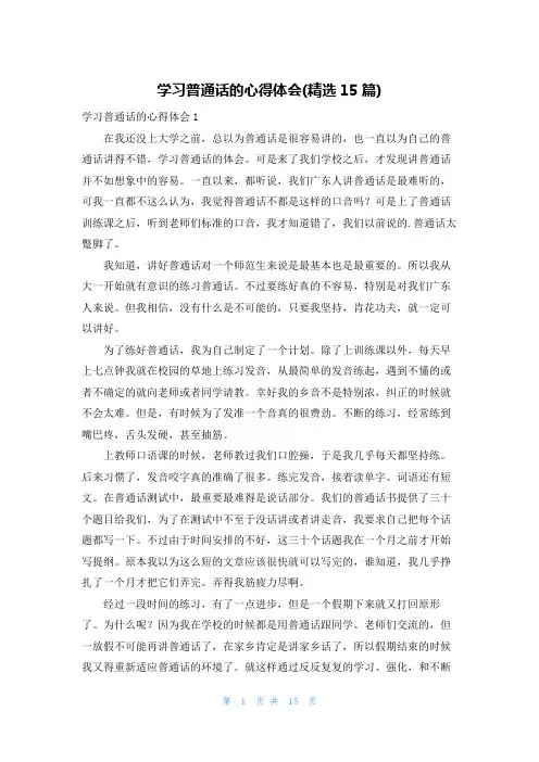 学习普通话的心得体会(精选15篇)学习普通话的心得体会1在我还没上大学之前,总以为普通话是很容易讲的,也一直以为自己的普通话讲得不错,学习普通话的体会。