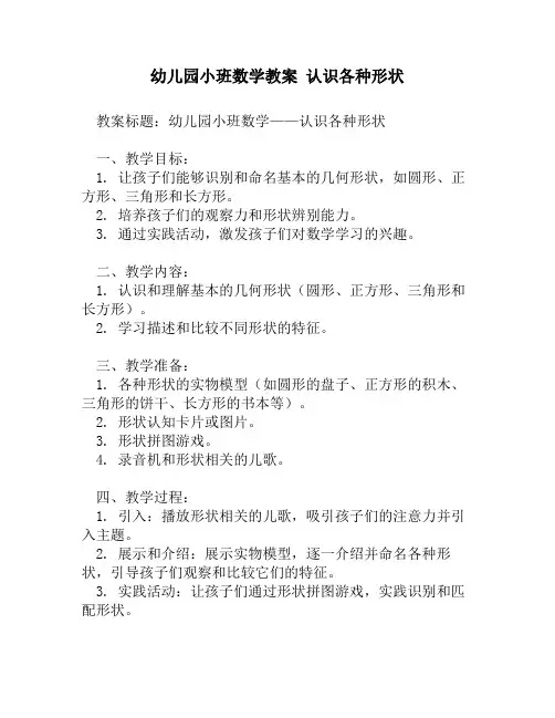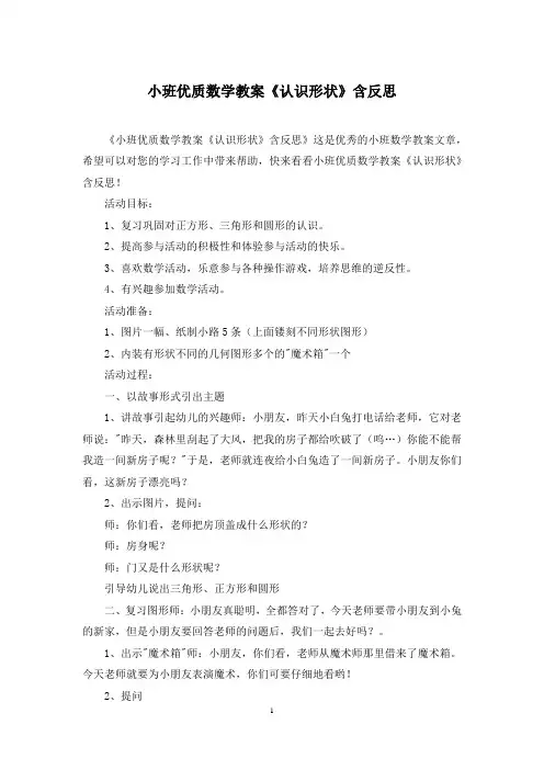幼儿园小班数学教案《认识形状》含反思教案名称:认识形状教学目标:1.通过观察和比较,使幼儿能够认识和区分不同的形状。