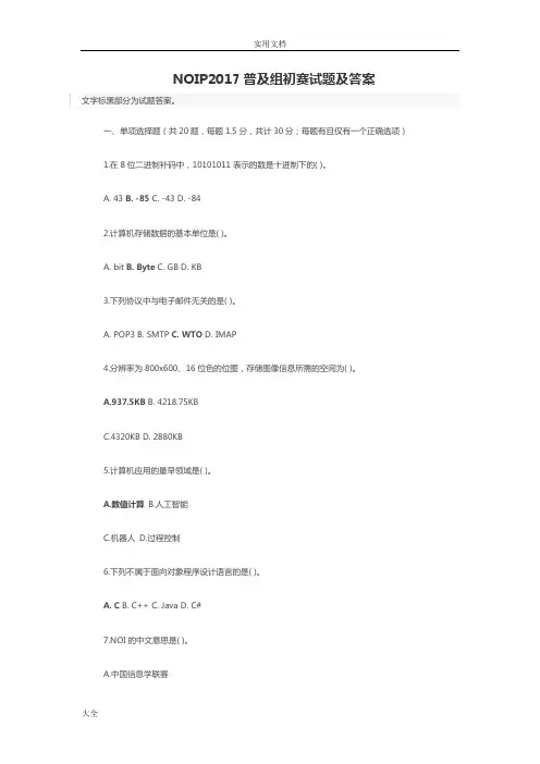 NOIP2017普及组初赛试题及答案文字标黑部分为试题答案。