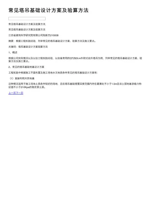 根据公司实际情况以及以往⼯程实践经验,以⾃备常⽤的QTZ63t.m外附式⾃升塔吊为例,列举常见的塔吊基础设计⽅案、验算⽅法及施⼯要点。