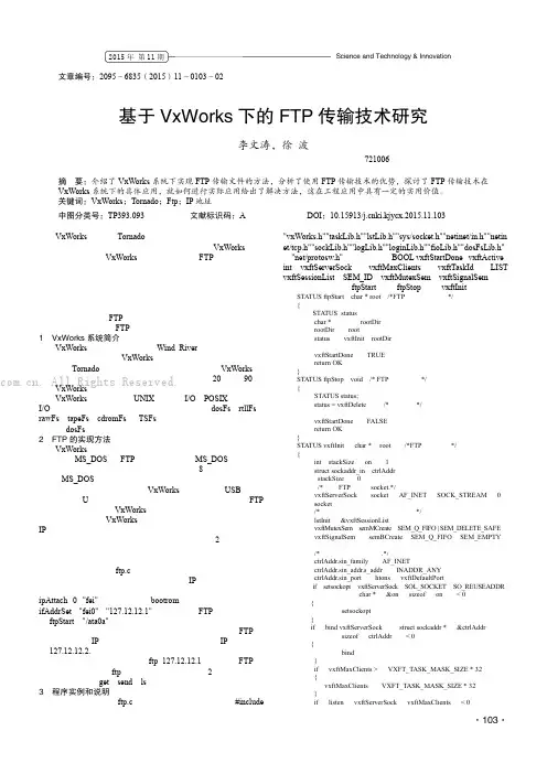 Science and Technology & Innovation ┃科技与创新·103·文章编号:2095-6835(2015)11-0103-02基于VxWorks 下的FTP 传输技术研究李文涛,徐 波(陕西长岭电子科技有限责任公司产品开发部,陕西 宝鸡 721006)摘 要:介绍了VxWorks 系统下实现FTP 传输文件的方法,分析了使用FTP 传输技术的优势,探讨了FTP 传输技术在VxWorks 系统下的具体应用,就如何进行实际应用给出了解决方法,这在工程应用中具有一定的实用价值。