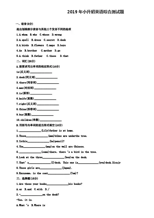 2019年小升初英语综合测试题一、语音(5分)选出划线部分读音与其他三个发音不同的选项1.A.whom B.who C.whose D.wrong2.A.spell B.dress C.secret D.desk3.A.birds B.flowers C.maps D.boys4.Ae B.brother C.mother D.go5.A.think B.father C.those D.that二、词汇(20分)A.按要求写出单词的相应形式(10分)1e(反义词)________________2.desk(同义词)________________3.there(同音词)________________4.man(对应词)________________5.is(原形)________________6.knife(复数)________________7.right(反义词)________________8.China(形容词)________________9.bus(复数)________________10.children(单数)________________B.用括号内单词的适当形式填空(10分)1.________________(Lily)father is at home.2.Those________________(man)bikes are underthe tree.3.Isthis________________(he)pencil?4.The________________(map)on the wall are Chinese.5.________________(come)there,there‘s a bird in the tree.6.Look at the three________________(box)on the desk.7.That’s________________(I)desk. This one is_______________(you)desk.21cnjy8.Those girls are________________(Japan).9.Excuseme,is the coat________________(Tom)?三、选择题(15分)1.Are these your books________________his books?A.orB.andC.withD./2.-________________on the desk?-Yes,it is.A.What‘sB.Where isC.Is Bill’s bagD.AreTom‘spens3.These are our books. Please look after________________.A.theirB.theyC.itD.them4.Where________________the students?A.amB.isC.areD./5."Hello! 34776855" "Hello!________________"A.This is Tom.B.I’m Tom.C.Who are you?D.Are you Tom?6.Miss Li is a teacher,Meimei is________________student.A.hisB.myC.herD.she7.________________are good friends.A.IB.AnnC.I and AnnD.Ann and I8.________________sister is an English teacher.A.Jim and KateB.Jim‘s and Kate’sC.Jim‘s and KateD.Jim and Kate’s9.Do you know the name ________________the girl?A.inB.onC.ofD.at10.It‘s a picture of________________family.A.BobB.Bob’sC.Bobs‘D.Bobs11.-Can you see my pen?-________________,Ican’t.A.ThanksB.You‘re rightC.YesD.I’m sorry12.Please come and________________the map.A.lookB.look afterC.look forD.look at13.________________go and see LiLei.A.Let weB.Let isC.Let‘sD.Lets14.The woman________________ the red coat is our teacher.A.onB.inC.underD.of15.The twins ________________one desk and two chairs.A.areB.isC.haveD.has四、句子配对(8分)从第Ⅱ栏中找出第Ⅰ栏中的答语ⅠⅡ1.Is she Chinese or Japanese? A.They are Tom and Mike.2.Who’s on duty today? B.Yes,it is.3.Are those oranges? C.That is Mr Wang.4.Can you see the bird? D.He is Japanese.5.Is it a car? E.It‘s on the desk.6.Who are they? F.No,they aren’t.They are pears.7.Who‘s that? G.Yes,I can.8.Where is the map? H.Lily is on duty today.五、句型转换,每空一词(15分)1.His ruler is in the box.(对划线部分提问)________________________________his ruler?2.She is Lucy and she is Lily.(改为选择疑问句)________________she Lucy________________Lily?3.Is he your friend?(改为复数)________________________________your________________?4.These are our apples.(改为单数)________________is________________________________.5.The boy is all right today(对划线部分提问)________________________________the boy today?6.They can see a bird in the tree.(对划线部分提问)________________________________________________see in the tree?六、完成句子,每空一词(15分)1.他找不到他的包。