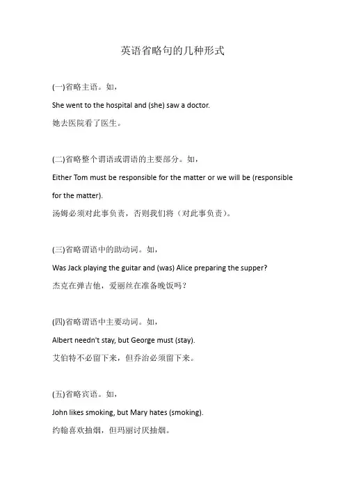 例如:•Peter is going to the supermarket. (to the supermarket: 介词短语)•So is Mary. (So: 其他成分)•He said he would visit us tomorrow. (tomorrow: 副词短语)•He said he would. (He: 其他成分)正如以上所述,省略句是一种简化语句结构的技巧,使句子更加简洁。