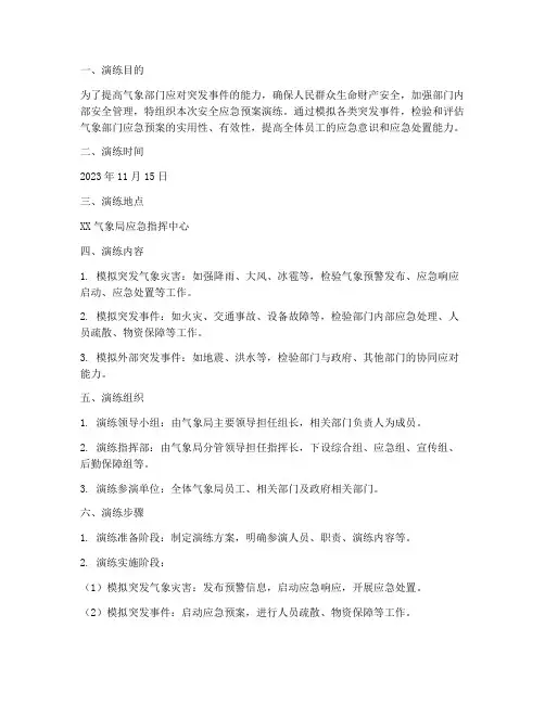 二、演练时间2023年11月15日三、演练地点XX气象局应急指挥中心四、演练内容1. 模拟突发气象灾害:如强降雨、大风、冰雹等,检验气象预警发布、应急响应启动、应急处置等工作。