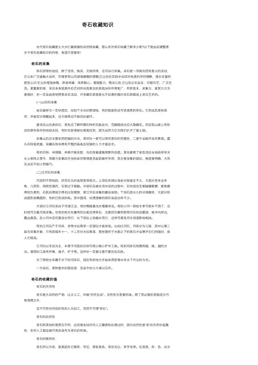 一、奇石收藏的背景和意义1.1 奇石的起源奇石的起源可以追溯到古代,人们就开始欣赏和收藏具有独特形态的石头。