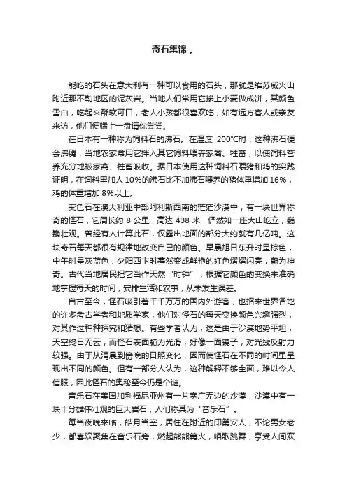 音乐石在美国加利福尼亚州有一片宽广无边的沙漠,沙漠中有一块十分雄伟壮观的巨大岩石,人们称其为“音乐石”。