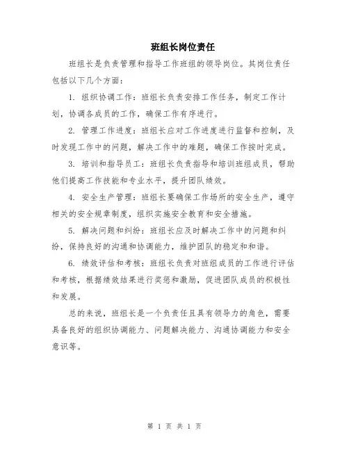 一、岗位职责1. 组织协调工作:班组长需要负责协调班组内各项工作,制定合理的工作计划,并确保任务按时完成。