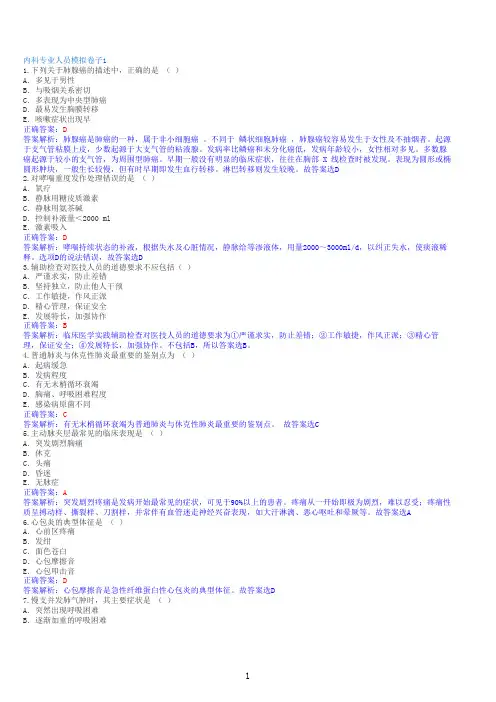 2015年内科学综合测试题及答案1 选择一题A1型1.慢性支气管炎临床分型为:A.单纯型、混合型B.单纯型、喘息型C.急性型、慢性型、迁延型D.单纯型、喘息型、迁延型E.单纯型、喘息型、混合型【答案】B2.医院内获得性肺炎中,最常见的致病菌是【答案】C3.支气管哮喘中、重度发作首选药物B.β受体激动剂【答案】DA.低钾、低钠、高镁血症B.低钙、低钠、低尿素血症C.低钙、低钠、高尿素血症D.高钾、低钠、低镁血症E.低钾、低钠、低镁血症【答案】EA.谷草转氨酶〔SGOT〕B.乳酸脱氢酶〔LDH〕C.红细胞沉降率〔ESR〕D.磷酸肌酸激酶〔CPK〕【答案】D【答案】D【答案】C【答案】A【答案】D10.有高碳酸血症的慢性呼吸衰竭患者,适宜的吸氧浓度为A.25%~30%B.35%~40%C.45%~50%D.55%~60%E.大于60%【答案】A【答案】D【答案】A【答案】DD.虽然适当治疗,心脏不能缩小【答案】A15.男性,40岁,吸烟史20年,胸片左肺门团块影。