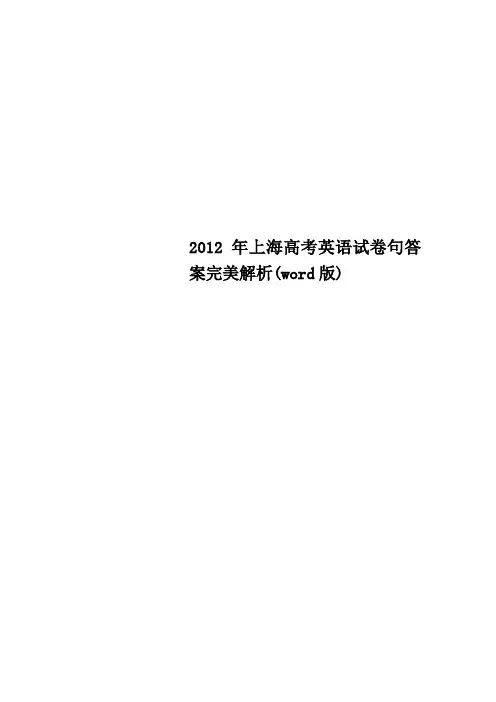 2012年上海高考英语试卷句答案完美解析(word版)2012年高考英语试题(上海卷)第1卷(共105分)I . Listening ComprehensionSection ADirections:In Section A, you will hear ten short conversations between two speakers. At the end of each conversation, a question will be asked about what was said. The conversations and the questions will be spoken only once. After you hear a conversation and the question about it,read the four possible answers on your paper, and decide which one is the best answer to the question you have heard.1. A. At a library. B. At a hotel. C. At a bank. D. At an airport.2. A. Relaxed. B. Annoyed. C. Worried. D. Satisfied3. A. Doctor and patient. B. Shop owner and customer.C. Secretary and boss.D. Receptionist and guest.4. A. He would have thrown $300 around.B. $300 is not enough for the concert.C. Sandy shouldn't have given that much.D. Dave must be mad with the money5. A. She lives close to the man. B. She changes her mind at last.C. She will turn to her manager.D. She declines the man's offer.6.A.2 B.3. C.4.D.57. A. Both of them drink too much coffee.B. The woman doesn't Like coffee at all.C. They help each other stop drinking coffee.D. The man is uninterested in the woman's story8. A. He doesn't. mind helping the woman.B. He hesitates whether to help or not.C. He'll help if the woman doesn't mindD. He can't help move the cupboard.9. A. He's planning to find a new job.B. He prefers to keep his house in a mess.C. He's too busy to clean his houseD. He has already cleaned his new house,10. A. She doesn't agree with the man.B. She is good at fmding a place to stay.C. She could hardly find the truth.D. She had no travel expei/ence in Britain.Section BDirections: In Section B, you will hear two short passages, and you will be asked three questions on each of the passages. The passages will be read twice, but the questions will be spoken only once. When you hear a question, read the four possible answers on your paper and decide which one would be the best answer to the question you have heard.Questions 11 through 13 are based on the following passage11. A. Use the company's equipment. B. Give orders to robotsC. Make decisions for the company.D. Act as Big Brother.12. A. Employees gain full freedom. B. Employees suspect one another.C. Employees' children are happy.D. Employees enjoy working there.13. A. Reward. B. Safety. C. Trust. D. HonestyQuestions 14 through 16 are based on the following passage14. A. Canada had a smaller population.B. Land was cheaper in Canada.C. They wanted to continue the Revolution.D. They were against Britain.15. A. They standardized Canadian English.B. They settled there after the Revolution.C. They enjoy a very high social position.D. They make up a small part of the population16. A. It is considered unique to some extent. B. It is greatly influenced by French.C. It is mainly linked to British culture.D. It dates back to the late 17th century.Section CDirections: In Section C, you will hear two longer conversations. The conversations will be read twice. After you hear each conversation, you are required to fill in the numbered blanks with the information you have heard. Write your answers on your answer sheet.Blanks 17 through 20 are based on the following conversation.Complete the form. Write ONE WORD for each answer.Blanks 21 through 24 are based on the following conversation.Complete the form. Write NO MORE THAN THREE WORDS for each answer.II. Grammar and VocabularySection ADirections: Beneath each of the following sentences there are four choices marked A, B, C and D. Choose the one answer that best completes the sentence.25. passion, people won't have the motivation or the joy necessary for creative thinking.A.For .B.WithoutC.BeneathD.By26. Is honesty the best policy? We _ that it is when we are little.A. will teachB. teachC. are taughtD. will be taught27. As Jack left his membership card at home,he wasn't allowed into the sports club.A. goingB. to goC. goD. Gone28. The new law states that people _ drive after drinking alcohol.A. wouldn'tB. needn'tC. won'tD. mustn't29. Only with the greatest of luck _ to escape from the rising flood waters.A. managed sheB. she managedC. did she manageD. she did manage30. - I hear that Jason is planning to buy a car.-I know. By next month, he _ enough for a used one.A. will have savedB. will be savingC. has savedD. Saves31. When he took his gloves off, I noticed that one had his name written inside.A. eachB. everyC. otherD. Another32. I have a tight budget for the trip, so I'm not going to fly _ the airlines lower ticket prices.A. onceB.ifC. afterD. Unless33. When Peter speaks in public, he always has trouble _ the right things to say.A. thinking ofB. to think ofC. thought ofD. think of .34. There is much truth in the idea _ kindness is usually served by frankness.A. whyB. whichC. thatD. Whether 35. Have you sent thank-you notes to the relatives from _ _ you received gifts?A. whichB. themC.thatD. Whom36. The club, _ _ 25 years ago, is holding a party for past and present members.A. foundedB. foundingC. being foundedD. to be founded37. - Was it by cutting down staff _ _shesaved the firm?- No, it was by improving work efficiency.A.whenB.whatC.howD.that38. - We've only got this small bookcase. Will that do?- No, _ _ I am looking for is something much bigger and stronger.A. whoB. thatC. whatD. Which39. "Genius" is a complicated concept, _ _ many different factors.A.involvedB.involving ,C.toinvolveD.beinginvolved40. The map is one of the best tools a man has _ _ he goes to a new place.A. wheneverB. whateverC. whereverD. HoweverSection BDirections: Complete the following passage byusing the words in the box. Each word can only be used once. Note that there is one word more than you need.A. maintainedB. seriousC. indicationsD. figuresE. anxiousF. concern G crisis H. decided I. available J. reversedFilmgoers should be told how many calories there are in the popcorn, ice cream and soft drinks that