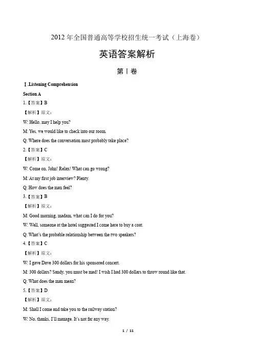 2012年全国普通高等学校招生统一考试(上海卷)英语答案解析第Ⅰ卷Ⅰ.Listening ComprehensionSection A1.【答案】B【解析】原文:W: Hello, may I help you?M: Yes, we would like to check into our room.Q: Where does the conversation most probably take place?2.【答案】C【解析】原文:W: Come on, John! Relax! What can go wrong?M: At my first job interview? Plenty.Q: How does the man feel?3.【答案】B【解析】原文:M: Good morning, madam, what can I do for you?W: Well, someone at the hotel suggested I come here to buy a coat.Q: What’s the probable relationship between the two speakers?4.【答案】C【解析】原文:W: I gave Dave 300 dollars for his sponsored concert.M: 300 dollars? Sandy, you must be mad! I wish I had 300 dollars to throw round like that.Q: What does the man mean?5.【答案】D【解析】原文:M: Shall I come and take you to the railway station?W: No, thanks, I’ll manage. It’s not far any way.Q: What can we learn about the woman?6.【答案】B【解析】原文:W: How many children have you got?M: Two. John’s five and Clair’s four. And there’s another one on the way. Q: How many children will the man most probably have?7.【答案】A【解析】原文:W: Do you know how I can stop drinking too much coffee?M: No, but I wish I did. I spend too much money at cafe’s.Q: What can we learn from the conversation?8.【答案】D【解析】原文:W: Could you give me a hand moving this cupboard, please?M: Well, I’d rather not if you don’t mind. I’m not feeling well today.Q: What does the man mean?9.【答案】C【解析】原文:M: Tom’ s house is a mess! Doesn’t he ever clean it?W: I guess he just has too much ails on his mind with that new job.Q: What can we learn about Tom?10.【答案】A【解析】原文:M: I didn’t have any trouble in finding accommodation in Britain.W: According to my experience, it sounds too good to be true.Q: what does the woman mean?Section B11.【答案】A12.【答案】D13.【答案】C【解析】原文:Well, I own a small data processing company, in which I employ about eight to ten workers. And the point I want to make has to do with trust. I know it’s possible to force people to be 100% efficient. But I think when you do that, you lose confidence and trust. I let my employees use our equipment and make personal phone calls. They are more than welcome to decide what is right and wrong. Because I think you can’t run a company by just giving orders to robots and watching them like big brother, right? I think you have to trust people and give them a little freedom. And also, as far as phone calls and all that go, I want my people to call home and check on their children and know their children are safe and sound. As a result, I have devoted employees who are willing to go that extra mile and I can honestly say they show up to work smiling. So I get more satisfaction and rewards by trusting my employees than by suspecting them of doing something wrong.14.【答案】B15.【答案】D16.【答案】A【解析】原文:The roots of Canadian English can be found in the events which followed the American revolution of 1776. Those who had supported Britain found themselves unable to stay in the new United States, and most went to Canada. They were soon followed by many thousands who were attracted by the cheapness of land. Within 50 years, the population of upper Canada had reached 100 thousand, mainly people from the United States. In the east, the Atlantic provinces had been settled by English speakers as early as the 15th century, but even today, these areas contain less than ten per cent of the population, so that they have only a limited role in the development of Canadian English. In Quebec, the majority of people use French as a mother tone. Here English and French exist together but uneasily. Because of its origins, Canadian English has a great deal in common with the rest of the English spoken in North America, and is often difficult to distinguish for people who live outside the region. To British people, Canadians may sound American; to Americans, they may sound British. Canadians themselves insist on not being identified with either, and certainly, there is a great deal of evidence in support of this view. Section C17.【答案】History18.【答案】HD330919.【答案】photography20.【答案】Tuesday【解析】原文:A: Good morning, Leeds University students registration center. B: Good morning, I need to register for a class. A:OK. May I take your name, please? B: Sure, it’s Andrew Smith.A: Which department do you study with? B: The history department. A: May I have your student ID? B: HD3309. A: What class are you trying to take? B: I want to take a photography class. A: Well, there’re only two classes open. B: Can you tell me what days the classes are on? A: One is on Tuesday, from 2 pm. to 4 pm. B: And the other?A: From 10:00 to 12:00 on Thursday. B: OK, sign me up for the class on Tuesday.A: Very well, then.21.【答案】religions22.【答案】good friends/more than friends/like a family23.【答案】their daughter24.【答案】a simple smile【解析】原文:A: Welcome to our program, Anny. Please tell our audience the best things about the experiment in international living.B: Well, my group was great! And I love my host family. A: Can you tell us about your group?B: Well, we were all high school students from the US. But we were very different.A: You mean from different cities, with different religions and cultures? B: Yes, and I was existed about that. We learnt that we weren’t really so different. A: Wha t do you mean?B: Well, we became such good friends. More than friends, we were like a family. A: Wonderful. I’d like to know more about your host family.B: Oh, I loved my host family in Costa Rica. They were my family, too. I felt like I was their daughter. A: So nice! Did you have any problems speaking with them?B: No, not really. Actua