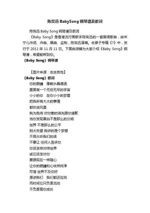 陈奕迅BabySong钢琴谱及歌词陈奕迅Baby Song钢琴谱及歌词《Baby Song》是香港流行男歌手陈奕迅的一首国语歌曲,由岑宁儿作词、作曲、编曲、监制,陈奕迅演唱。