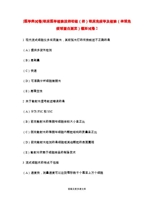 临床医学检验技师初级(师)临床免疫学及检验(免疫细胞分离及检测技术)-试卷2临床医学检验技师初级(师)临床免疫学及检验(免疫细胞分离及检测技术)-试卷2(总分:52.00,做题时间:90分钟)一、 A1型题(总题数:26,分数:52.00)1.外周血单个核细胞是指(分数:2.00)A.单核细胞B.淋巴细胞C.单核细胞和淋巴细胞√D.吞噬细胞E.中性粒细胞解析:解析:单个核细胞当然是指只有一个核的细胞,包括单核细胞和淋巴细胞。