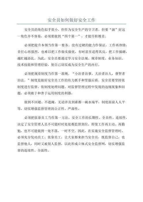 安全员的工作技巧与经验分享安全员是企业中负责安全管理工作的重要角色,他们负责制定并执行各项安全措施,保障员工和设备的安全。