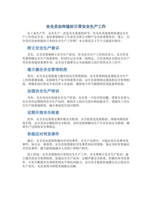 二、安全培训措施安全员需积极组织员工安全培训,确保他们掌握正确的安全操作流程和使用安全设备的方法。
