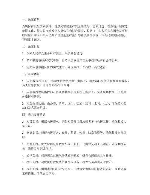 二、应急救援原则1. 我们的应急救援工作以“保护生命、减轻损失、恢复功能”为原则。