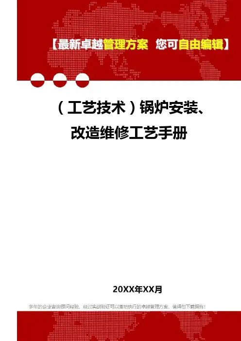 锅炉安装维修作业指导书本页仅作为文档页封面,使用时可以删除This document is for reference only-rar21year.March锅炉安装改造工程施工工艺文件(B版)批准:审核:编制:二OO九年八月说明本《锅炉安装改造工程施工工艺文件》系按有关标准、《锅炉安装改造单位监督管理规则》的有关要求,并结合公司现有的资源状况及目前的技术水平编制,属于《锅炉安装改造质量管理手册》及《程序文件》的支持性文件。