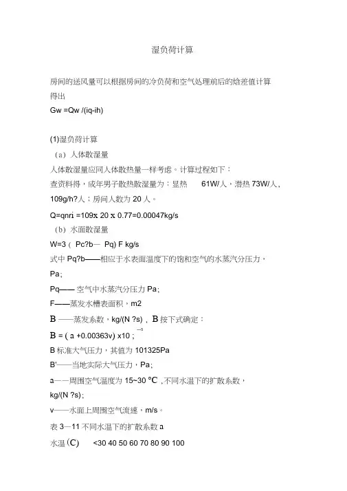 湿负荷计算房间的送风量可以根据房间的冷负荷和空气处理前后的焓差值计算得出Gw =Qw /(iq-ih)(1)湿负荷计算(a)人体散湿量人体散湿量应同人体散热量一样考虑。