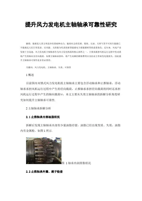 关键词:风力发电机、主轴轴承、失效、可靠性1概述目前国内双馈式风力发电机组主轴轴承主要包含浮动轴承和止推轴承,浮动轴承承担风机运行过程中产生的径向载荷,止推轴承承担径向载荷的同时还承担风机运行过程中产生的轴向载荷[1],本文主要从失效主轴轴承的拆解分析角度研究如何提升主轴轴承可靠性.2主轴轴承拆解分析2.1止推轴承内部油脂状况拆解后发现主轴轴承内部有少量油脂存留,油脂已经出现变质、失效,油脂内有金属粉,如图1所示.图 1轴承内润滑脂状况2.2止推轴承外圈、滚子检查轴承外圈靠近齿轮箱端的滚道及滚子出现磨损,局部出现剥落,另一侧滚道未见磨损,如图2所示.图 2外圈滚道磨损情况2.3止推轴承内圈检查轴承内圈滚道齿轮箱侧圆周剥落较为严重,而轮毂侧滚道情况良好,其剥落位置与外圈剥落位置相对应,如图3所示。