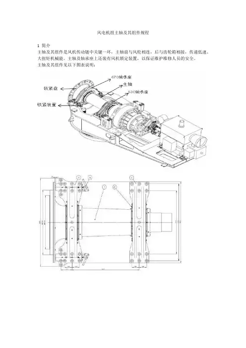 风电机组主轴及其组件规程1 简介主轴及其组件是风机传动链中关键一环,主轴前与风轮相连,后与齿轮箱相接,传递低速、大扭矩机械能。