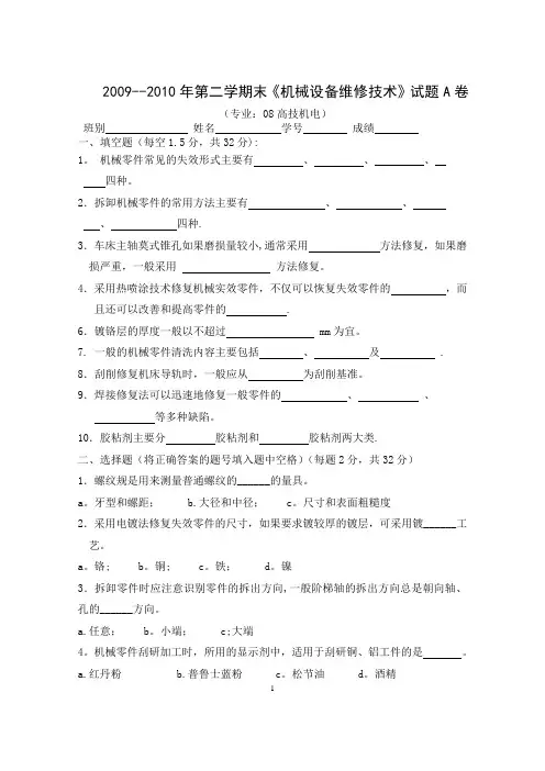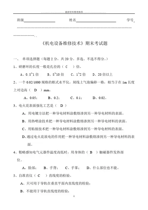 班级姓名学号………………………………………………………………………………………………………..《机电设备维修技术》期末考试题一、单项选择题(每题2分,共20分。