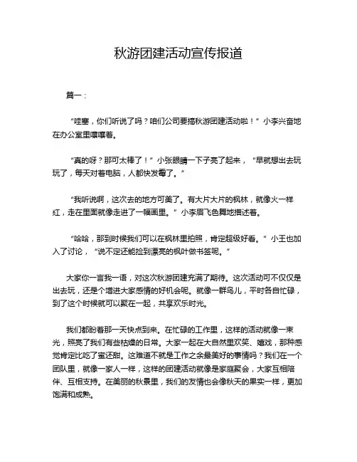 幼儿园秋游活动报道一、活动主题为了让幼儿增强团队意识,培养动手能力,丰富幼儿的课外生活,我园秋游活动主题确定为“探秋之旅,快乐成长”。
