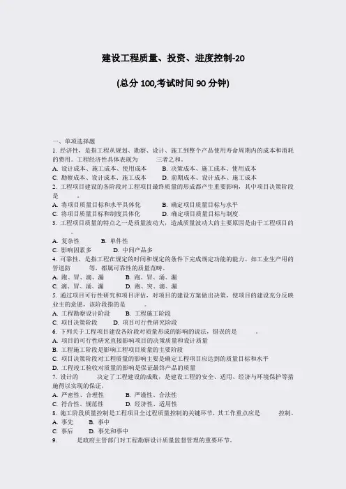 建设工程质量、投资、进度控制-20(总分100,考试时间90分钟)一、单项选择题1. 经济性,是指工程从规划、勘察、设计、施工到整个产品使用寿命周期内的成本和消耗的费用。