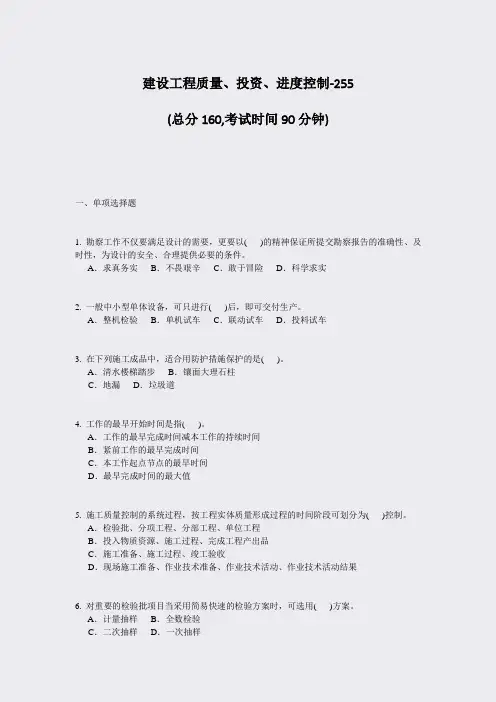 建设工程质量、投资、进度控制-255(总分160,考试时间90分钟)一、单项选择题1. 勘察工作不仅要满足设计的需要,更要以( )的精神保证所提交勘察报告的准确性、及时性,为设计的安全、合理提供必要的条件。