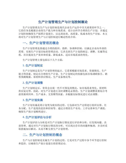二、生产与计划控制的概念生产与计划控制是实施生产计划的过程,它是对生产过程中各个环节进行控制和监控,以确保生产按计划进行的管理活动。