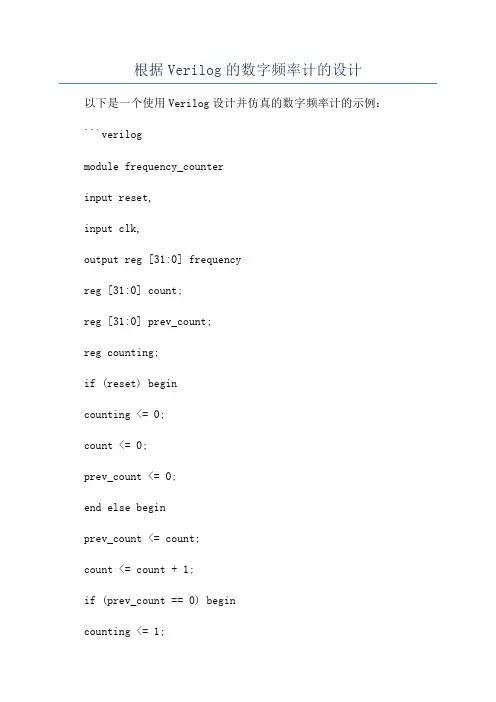 根据Verilog的数字频率计的设计以下是一个使用Verilog设计并仿真的数字频率计的示例:```verilogmodule frequency_counterinput reset,input clk,output reg [31:0] frequencyreg [31:0] count;reg [31:0] prev_count;reg counting;if (reset) begincounting <= 0;count <= 0;prev_count <= 0;end else beginprev_count <= count;count <= count + 1;if (prev_count == 0) begincounting <= 1;counting <= 0;frequency <= count;count <= 0;endendendendmodule```为了仿真该模块,可以使用任何支持Verilog仿真的工具,如ModelSim。