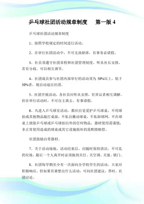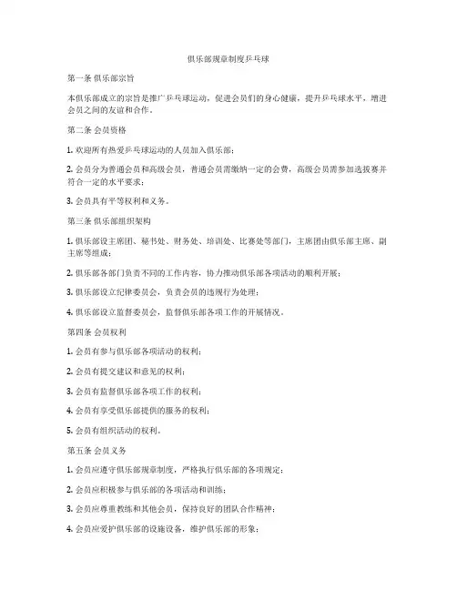 乒乓球俱乐部章程及管理规定第一章总则第一条为规范乒乓球俱乐部的管理,促进会员之间的交流与友谊,特制定本章程。