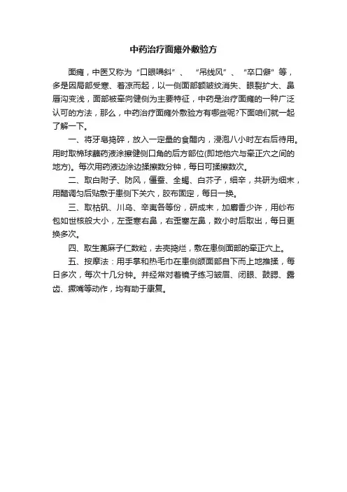 中医治疗面瘫的方法文章目录*一、中医治疗面瘫的方法*二、面瘫的危害*三、如何预防面瘫中医治疗面瘫的方法1、中医治疗面瘫的方法1.1、中药内服白附子(另包先下1小时)15g,菊花10g,银花30g,夏枯花30g,蝉花10g,川红花3g,芥花10g,薄荷10g,蝉衣30g,僵蚕10g,另全虫10g,蜈蚣5g,橘络15g,丝瓜络15g,羌活10g,白芷3g.1.2、针刺分期治疗急性期:远端取穴为主,风池风府大椎曲池列缺合谷;亚急性期:局部取穴为主,患侧阳白、太阳、地仓透颊车、迎香透四百、下颌部足阳明经筋排刺、双侧合谷交换;2周后:电针:阳白、太阳、地仓、颧髎,断续波温和刺激,以见针炳跳动而无痛感为宜,每日1次,每次20分钟;如迁延不愈达2月以上的患者可采用梅花针扣刺阳白、四白穴。