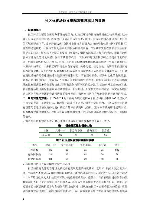 二、调查方法我们选择了某市中心区作为调查地点,通过问卷调查以及实地观察的方式,收集了关于社区体育设施的相关数据。