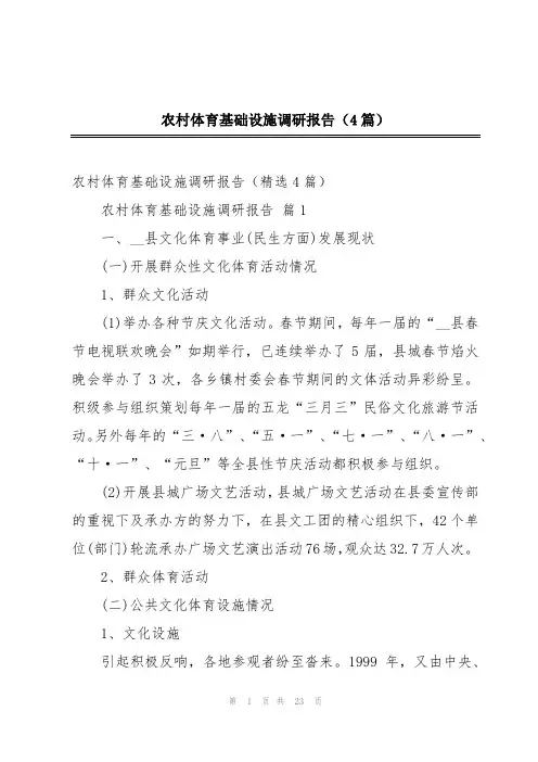 农村体育基础设施调研报告(4篇)农村体育基础设施调研报告(精选4篇)农村体育基础设施调研报告篇1一、__县文化体育事业(民生方面)发展现状(一)开展群众性文化体育活动情况1、群众文化活动(1)举办各种节庆文化活动。